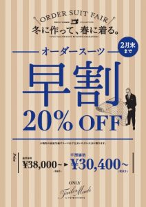 ビジネスウェア製造販売を行う株式会社オンリー(本社:京都市下京区、代表取締役会長兼社長 中西浩一)では、2018 年1月 1 日(月)より、自社のオーダースーツブランド「テーラーメイド」において、厳選した2018年春夏最新生地コレクションからスーツを20%OFFの価格でオーダーできる「早割」キャンペーンを、全国43店舗の「ONLY」、「ONLY PREMIO」、「ONLY WOMEN」、「ONLY京都TAILOR」 http://only-co.cv/shop/ とオンラインストア http://ec.only-co.cv/ にて開催します。生地やデザイン、ディテールにこだわったテーラークオリティの上質なスーツをぜひこの機会にお試しください。