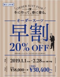 自社工場の閑散期に次シーズンのオーダースーツのご注文をお受けするため、工場稼働の無駄をなくし、リーズナブルにオーダースーツを提供することができます。納期は約2ヶ月間、生地代の20%OFFの価格でご注文可能。ご提供価格は通常で一着¥38,000~のところ、20%OFFの\30,400~(税抜き、オプション別途)+直送代。初めてオーダースーツをお作りになる方でもお試しいただきやすい大変お得なキャンペーンです。