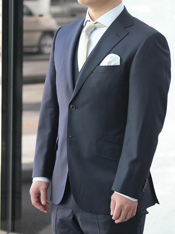 - 正統派のネイビー無地の3ピーススーツ 四条烏丸店
