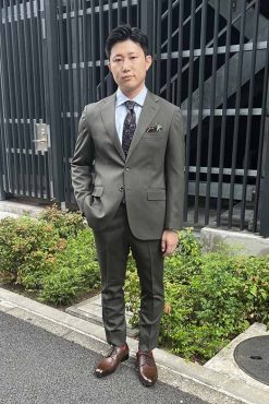 ウール100%なのにストレッチ性のある生地で動きやすく、ジャケットの裏地はグレーの柄ものを選ぶことで統一感がある仕上がりになるようオプションを選んでみました。