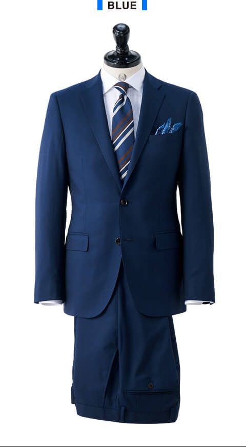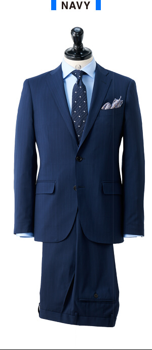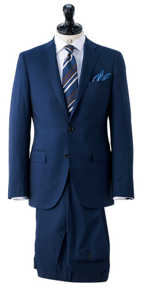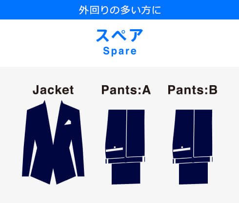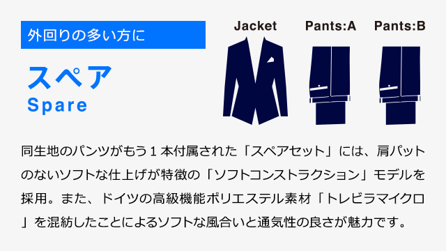同生地のパンツがもう1本付属された「スペアセット」には、肩パットのないソフトな仕上げが特徴の「ソフトコンストラクション」モデルを採用。また、ドイツの高級機能ポリエステル素材「トレビラマイクロ」を混紡したことによるソフトな風合いと通気性の良さが魅力です。
