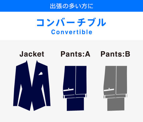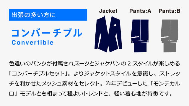 色違いのパンツが付属されスーツとジャケパンの2スタイルが楽しめる「コンバーチブルセット」。よりジャケットスタイルを意識し、ストレッチを利かせたメッシュ素材をセレクト。昨年デビューした「モンテカルロ」モデルとも相まって程よいトレンドと、軽い着心地が特徴です。