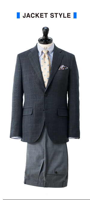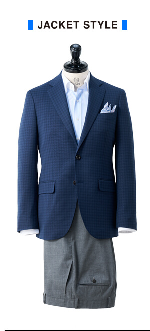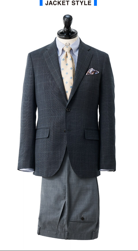 グレーのパンツとも相性抜群トラベラープラスパンツスーツブルー/チェック 3-0334-41-254 ¥38,000(+tax)