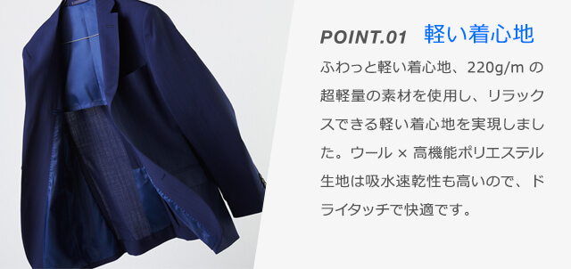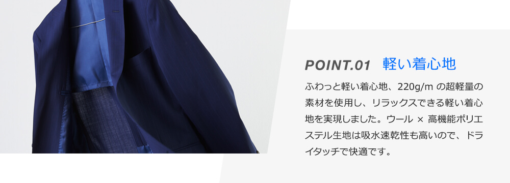 超軽量素材、ストレッチ性抜群。「洗える」にプラスしてサマースーツのマスト機能を備えています。吸水速乾性が高いのでドライタッチで快適です。