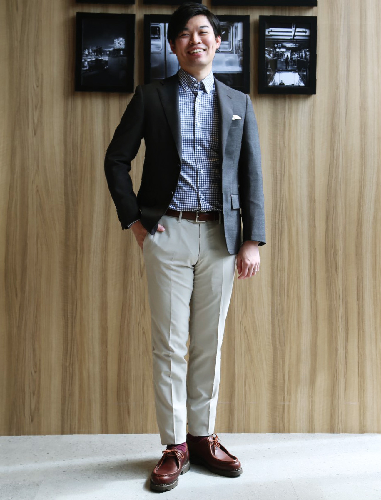 それは少しカジュアルダウンしたスーツが良いと思います。フォーマルな装いにはフォーマルなコーディネートを、カジュアルな装いにはカジュアルなコーディネートをすれば違和感がないのです。カジュアルダウンしたスーツとは??下記の2つが重要です。
