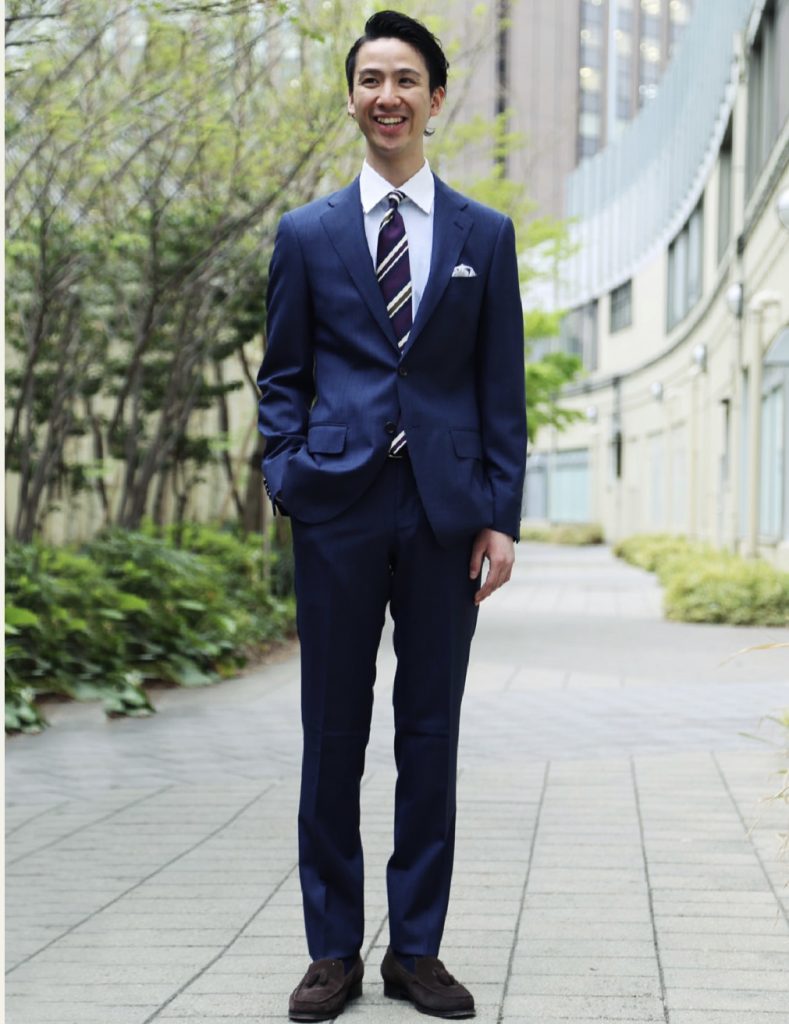 スマートにスーツを着こなしたいなら、ネイビーブルーのスーツがおすすめです。ネイビーブルーの濃い色は身体が引き締まって見えます。
