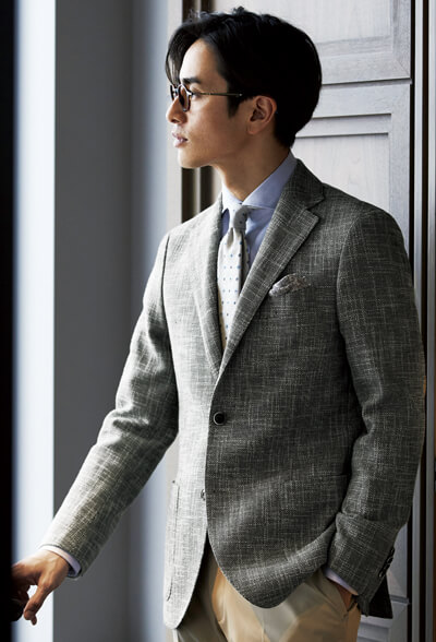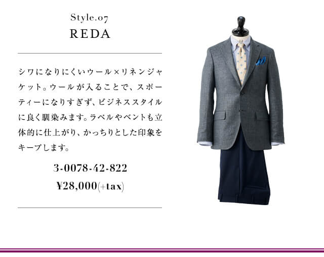 REDAシワになりにくいウール×リネンジャケット。ウールが入ることで、スポーティーになりすぎず、ビジネススタイルに良く馴染みます。ラペルやベントも立体的に仕上がり、かっちりとした印象をキープします。