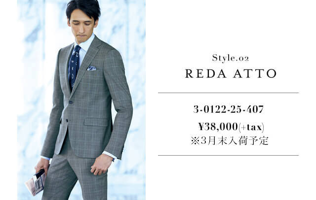- 高温多湿な日本のビジネスシーンに最適な「ATTO(アット)」。SUPER130’sの高級原料を用いつつ、ナチュラストレッチ、防シワ性、撥水性といった高機能を実現したREDA社が誇る機能素材です。