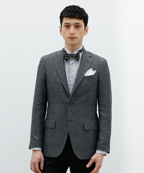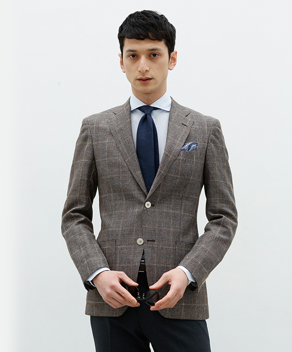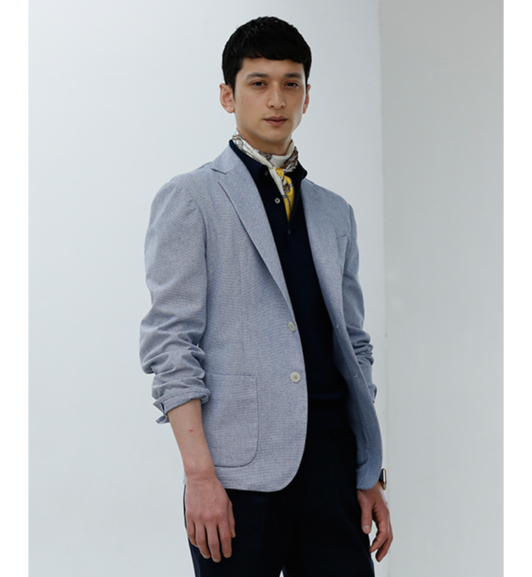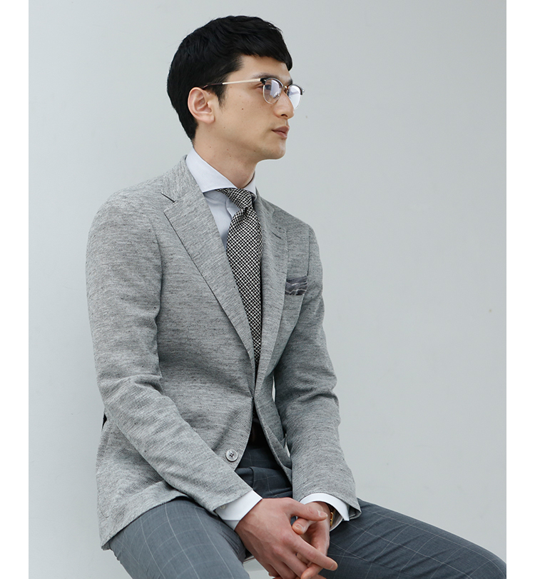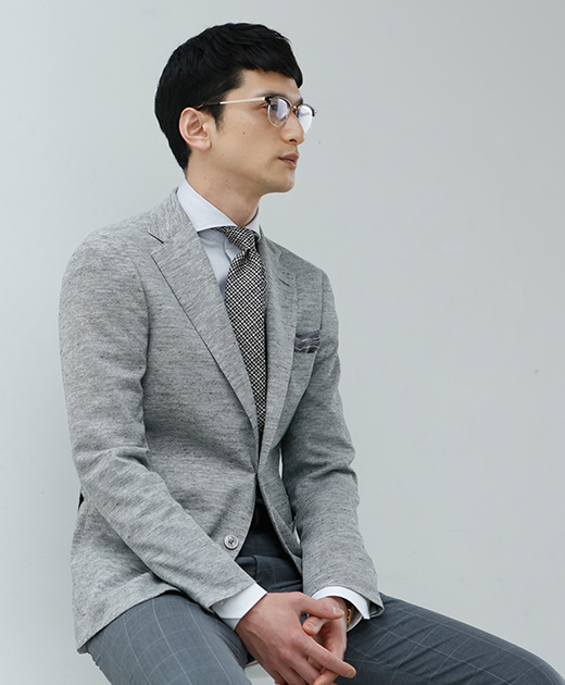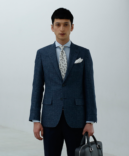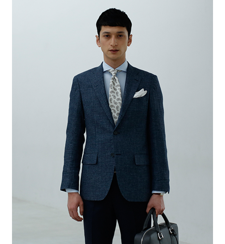 きっちりとしたタイドアップは男のビジネススタイルの基本。その際、あえてスーツではなくインポート生地のリネン混ジャケットを纏えば、装いに涼やかさと大人の余裕が漂います。