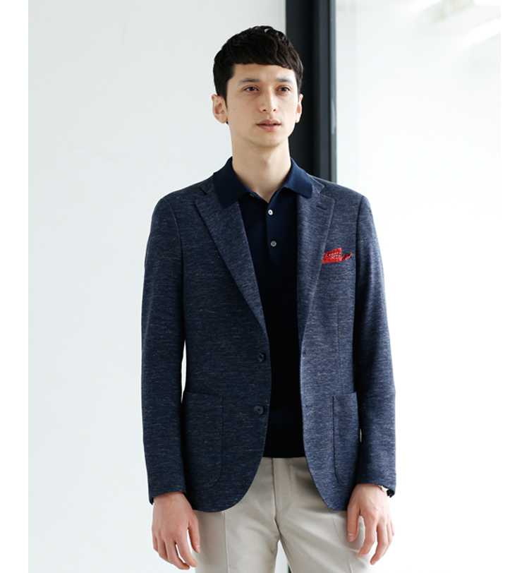 ノルマンディ産の上質なリネンを用いたネイビーのジャージージャケット。清涼感のある表情ながら、硬さやざらつき感のないなめらかな生地は、軽やかなノータイスタイルに最適です。