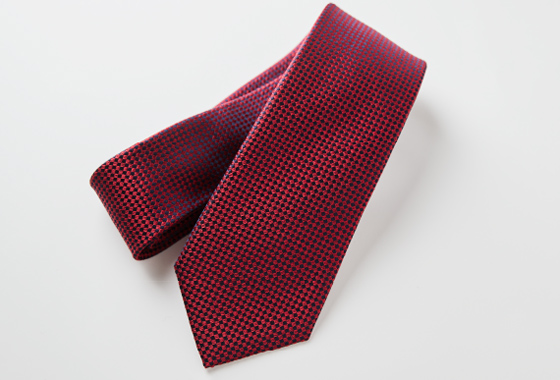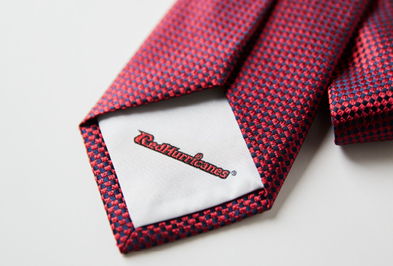 チームカラーのREDを基調に、ネイビーの色糸を混ぜて織り上げた味わい深いオリジナルネクタイ生地。大剣の裏にはチームのロゴをあしらっています。