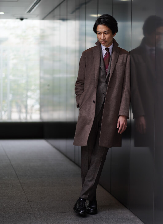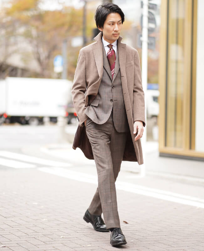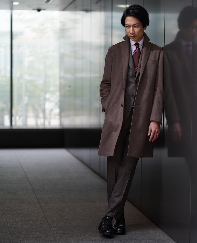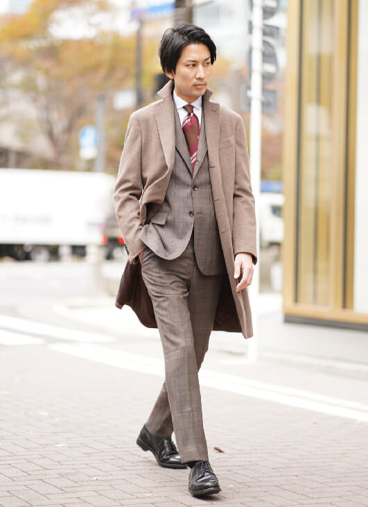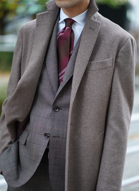 最新のグローバルトレンドのコーディネートです。ベージュやブラウンのナチュラルカラーにピンクがかったワインレッドが効いたネクタイを差し色に使っています。トープのカシミヤ100%のコートはトレンドでありながら、とても上品な印象です。全身を同系色のグラデーションに合わせるのが今の気分です。白シャツを合わせることで、更に上品な大人コーディネートの完成です。