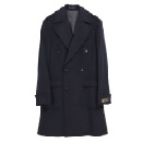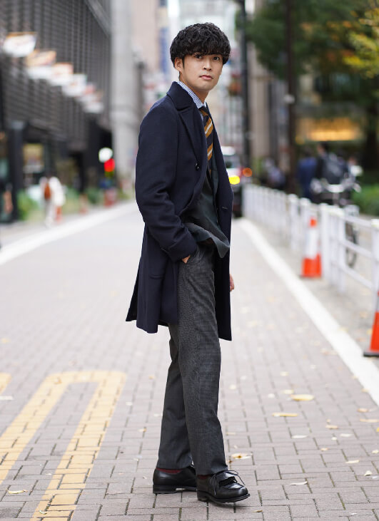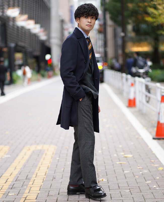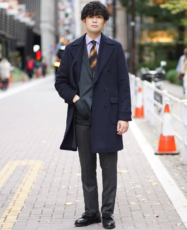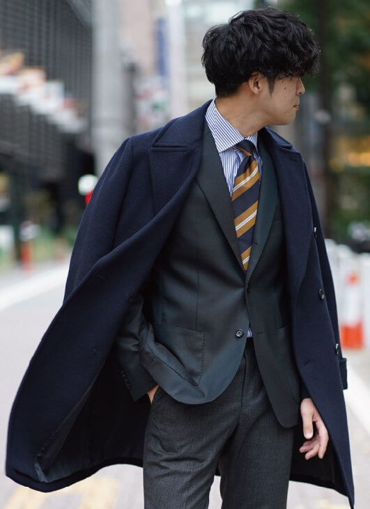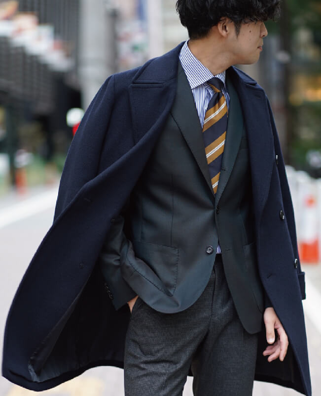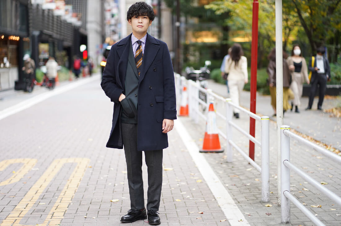 続いてのコーディネートは、ネイビーのポロコートにチャコールグレーのパンツととてもトラッドな合わせ方です。これにネイビーブレザーだとベーシックですが、トレンドカラーのグリーンのジャケットが差し色になって、とても今っぽい雰囲気に変わります。トラッドな印象のイエローが効いたネクタイは、コートのボタンを付けても、胸元の良いアクセントになります。ネオ・トラッドのコーディネートです。