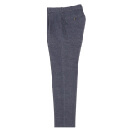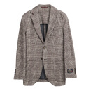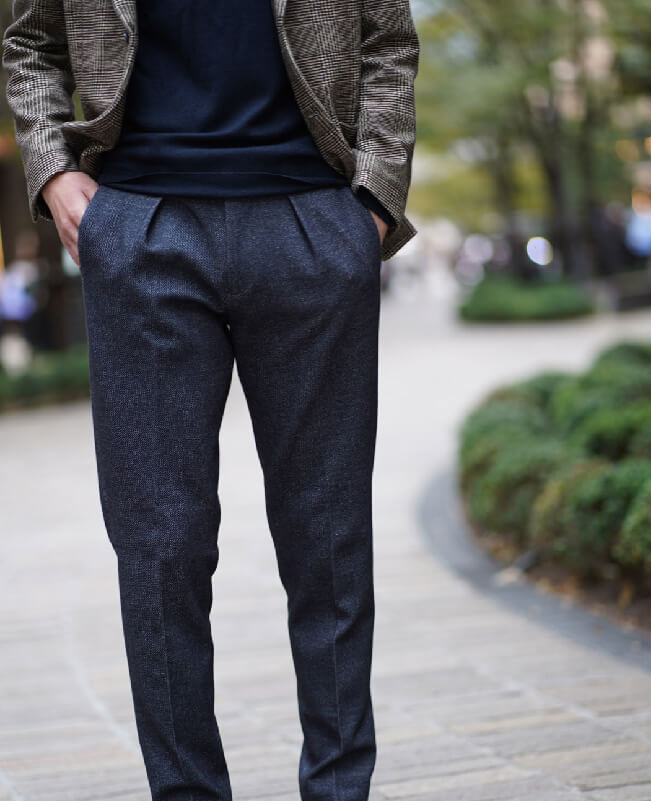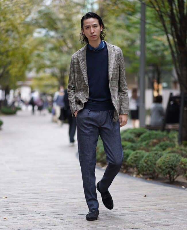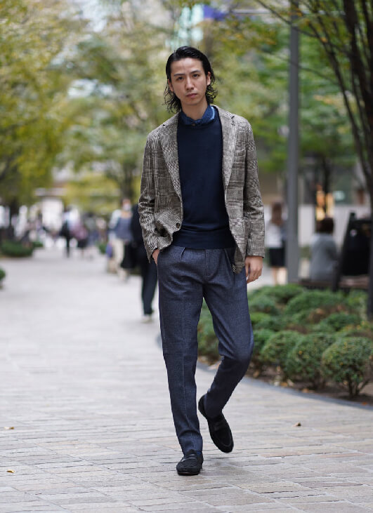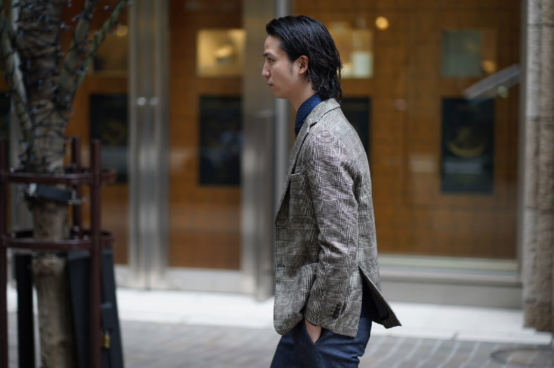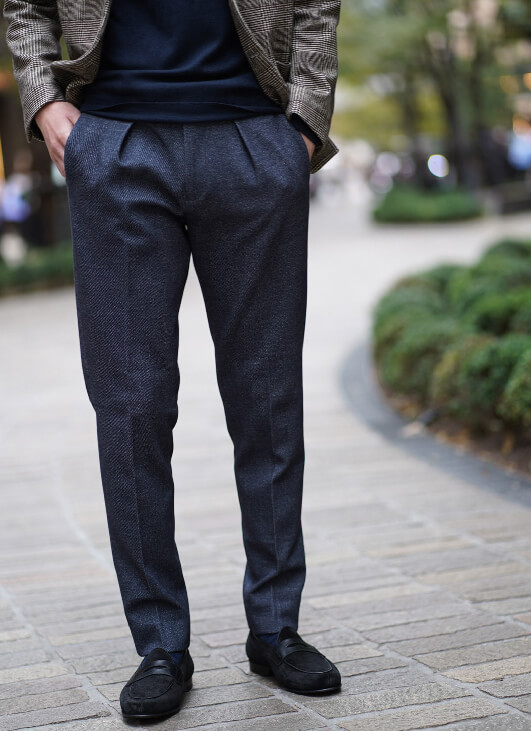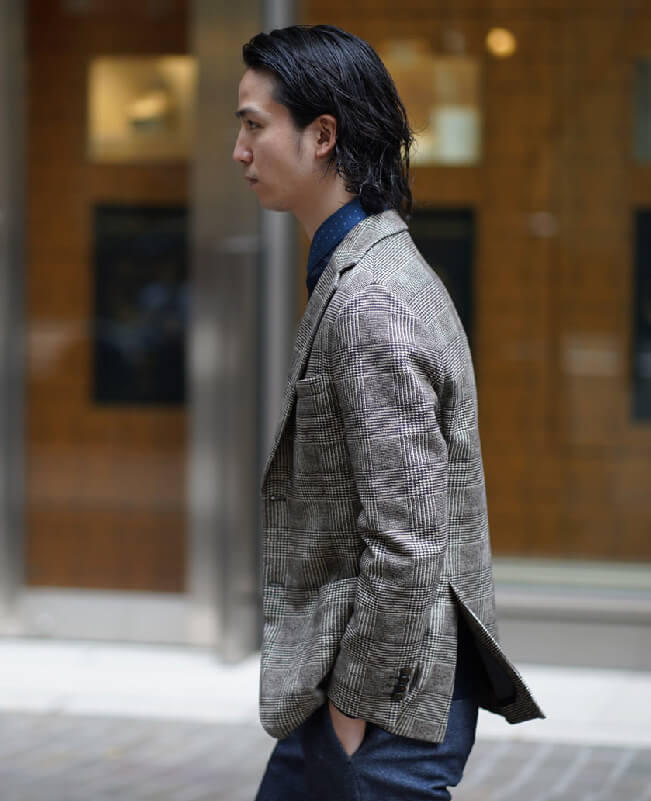 大人気のジャージー素材のセットアップを使ったコーディネートです。イタリア生地らしく美しくリアルなプリント柄が特徴です。ジャケットはブラウンのグレンチェック、パンツはデニム柄です。上下を組み合わせることも可能で、パンツも一見デニムスラックスにしか見えません。インプリーツのお洒落なディテールを配し、それでいてジャージーの伸縮性でとても楽な履き心地です。インナーニットもネイビーで統一し、スポーティーでシックなイタリアンスタイルが完成しました。