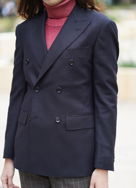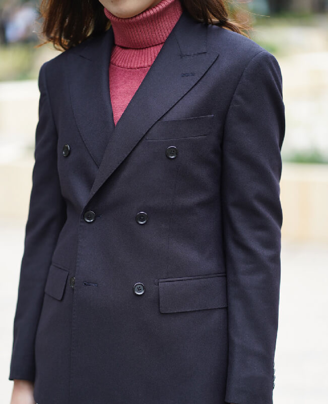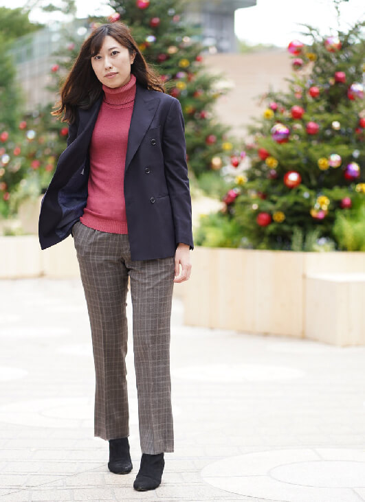 メンズ仕立てダブルブレストジャケットを使ったコーディネートです。インナーにはざっくりと編まれた温かみあるタートルニットを合わせました。イタリア製の美しい色目は、女性らしさを引き立てます。足元にはゆったりとしたタック入りパンツにブーツを。コートやマフラーがなくても、すっきりとしていて暖かいアクティブな冬コーデになりました。きっと寒さも忘れてしまうでしょう。