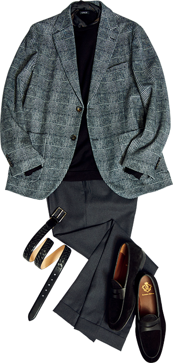 グレーパンツを合わせたジャケパンスタイル。コンパクトなシルエットやパッチポケット仕様、不均一なグレンチェックプリントなど、ジャケット単品でも合わせやすさが考慮されています。黒のコットンニットを合わせたモノトーンが洒脱。