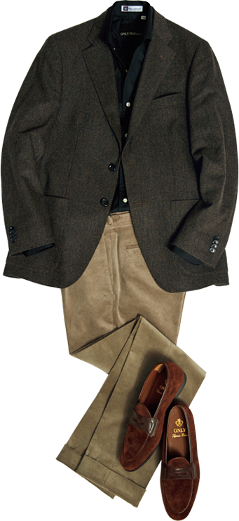 ジャケット単品でも着回しやすいのは、温もりある豊かな表情ゆえ。そのツイーディな素材感には、コーデュロイやスエードなど同じく温かみを感じさせる素材が好相性です。インナーのみ端正なブラックのシャツで引き締めるとバランス良し。