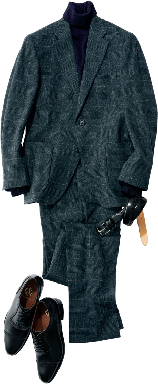 チャコールのグレンチェックにホワイトのオーバーペーンを重ねた生地は、軽量なウールブレンドの三者混素材。ツイーディで貫禄のある表情ですが、タートルネックを合わせたスポーティな着こなしもさまになり、上下単品でも着こなしやすいはず。