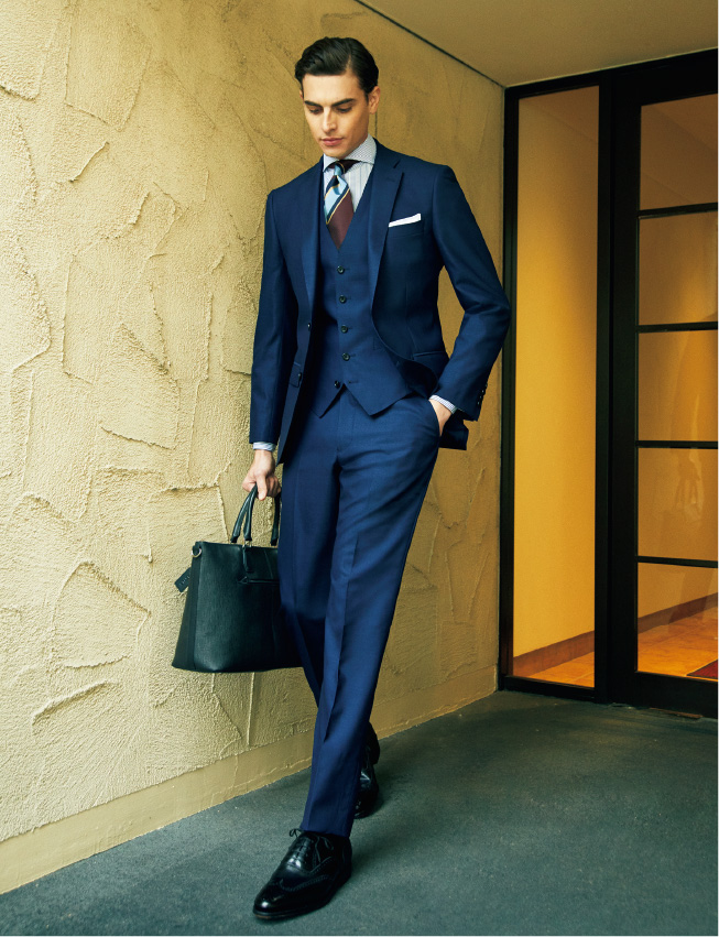 ネイビースーツはドビー調の織りにシルクをブレンド。ビジネススタイルにフォーマルの意識が備わりました。スーツの正統であるスリーピースが、仕事に向かう気持ちを凛と引き締めてくれます。