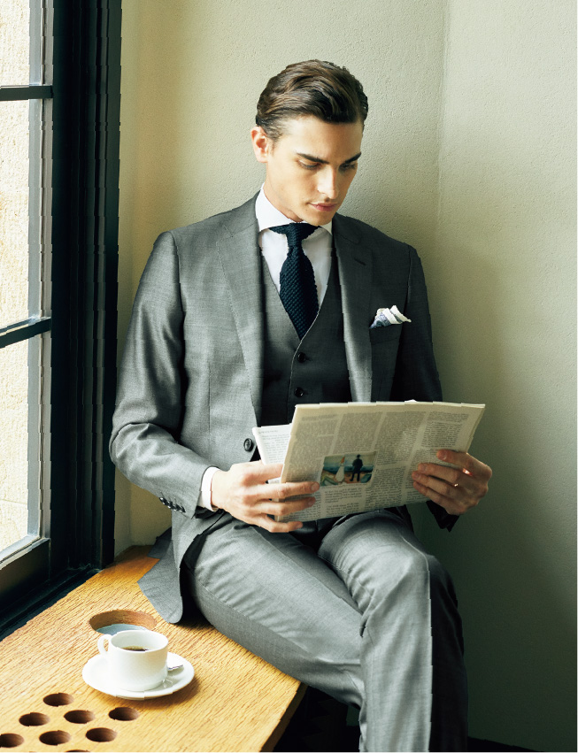 シャークスキンのグレースーツはニットタイで落ち着かせて。オフィスではストイックな気分を纏いながらも、週末の夜ともなれば華やかな照明に映える遊び着としても最適な一着となるのです。