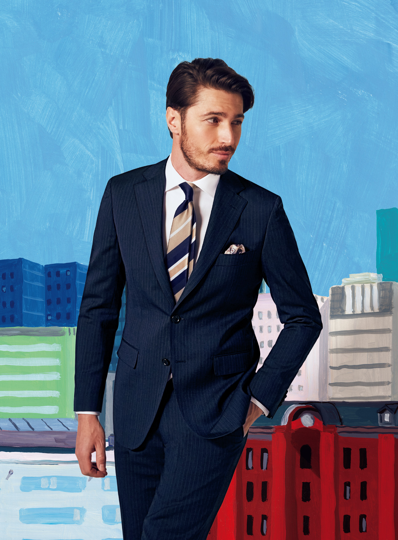 知的な印象をグっと深めてくれるネイビーストライプスーツ。ネクタイのストライプ幅を変えているので、全体的にまとまった雰囲気に。