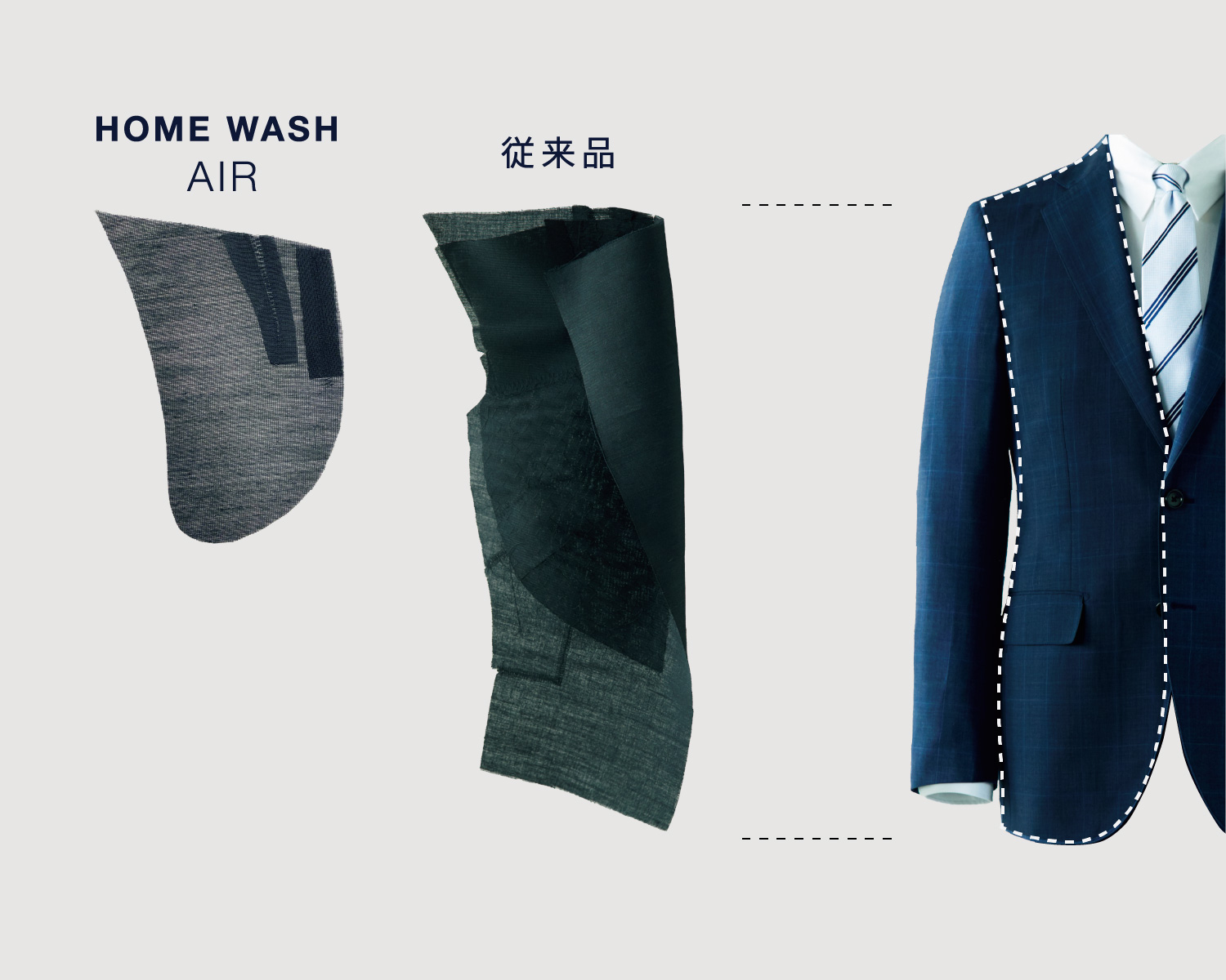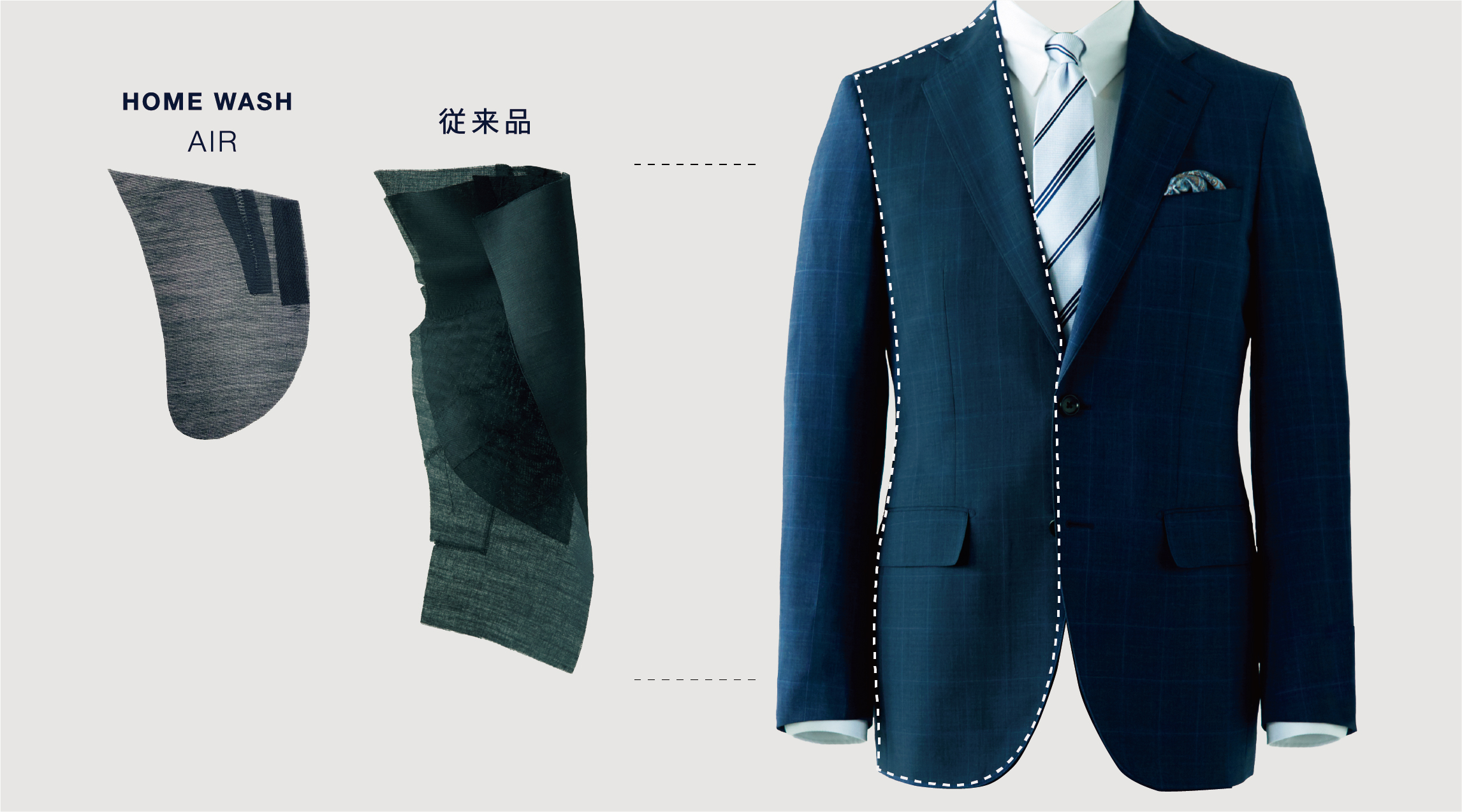 ホームウォッシュ エアのためだけに開発した軽量ウールポリエステル生地は、1mあたりわずか190g。また芯地には、オンリーオリジナルのハリある素材にウレタン樹脂加工を施すことで通気性と軽量性、さらに高級な天然毛芯に匹敵する芯地を採用。