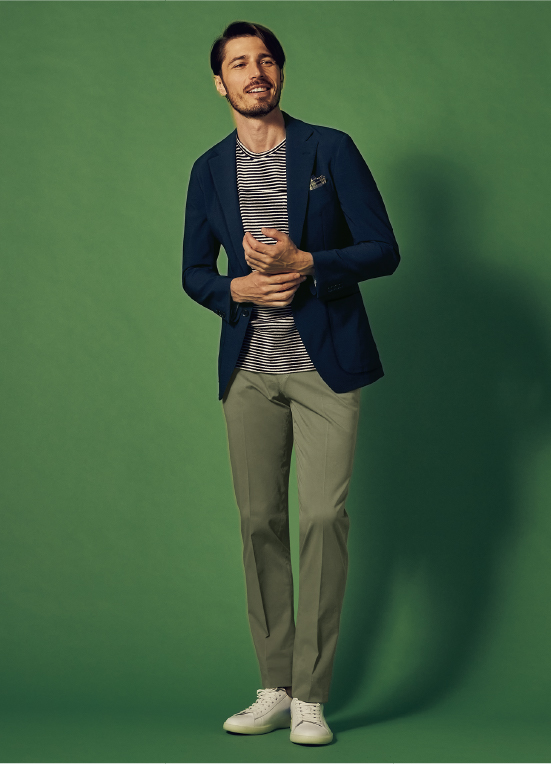 インナーやシューズで変化をつけると、様々なスタイルが楽しめるセットアップ。ジャケット単品としても幅広く着こなせるアイテムです。