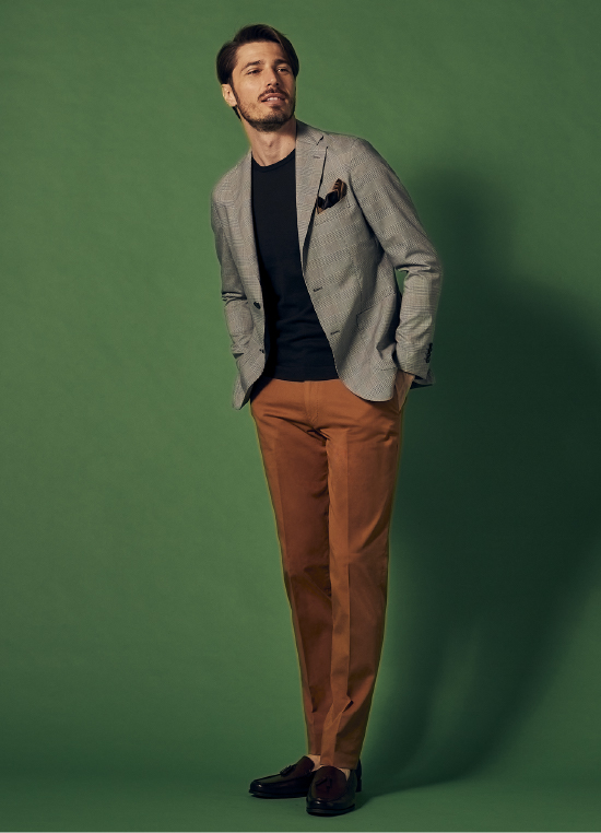 同じジャケットを着回し、ブラウンのコットンパンツと黒のカットソーを合わせれば、少しカジュアルダウンした雰囲気にぴったり。ジャケットはストレッチが効いていて、リラックスした着心地。