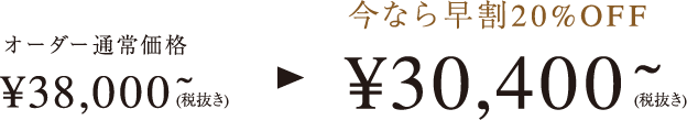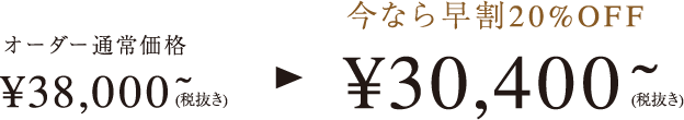 ONLYのオーダースーツブランド「テーラーメイド」では、工場の閑散期(1~2月と7~8月の年2回)に次シーズンの注文をお受けすることで、工場稼働の無駄をなくし、オーダースーツをリーズナブルに提供しています。納期を約2ヶ月間いただき、20%OFFの価格でご注文いただけます。