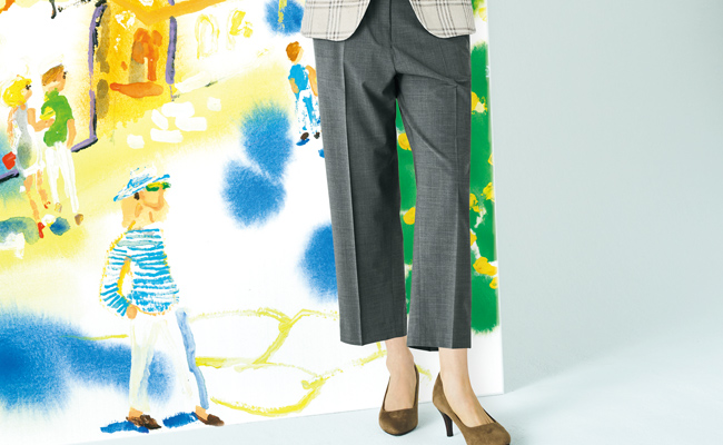 新しいパンツは、ワンタックでセンタークリースが入った、きちんと感のあるワイドシルエット。ハイウエストで股上を深くし、丈の長さがしっかり見えるので、パンプスはもちろん、ローファーや軽快なスニーカーまで合わせやすく、足長効果もあります。
