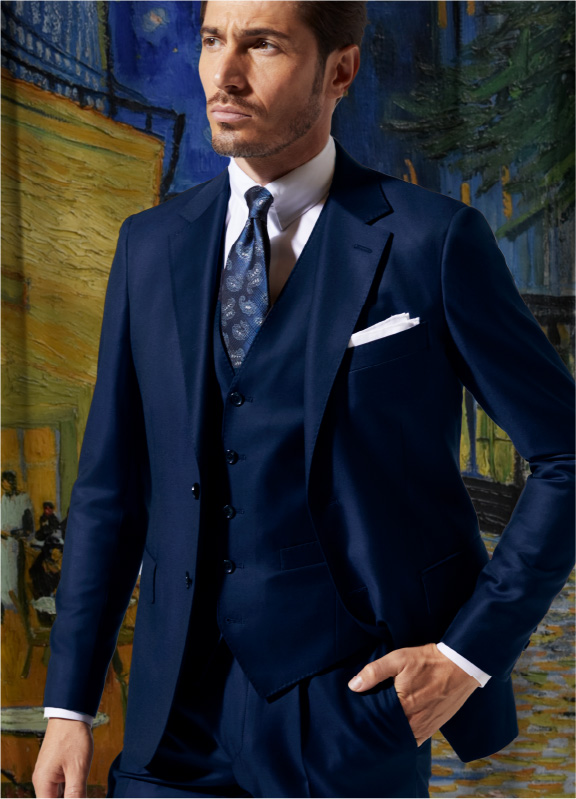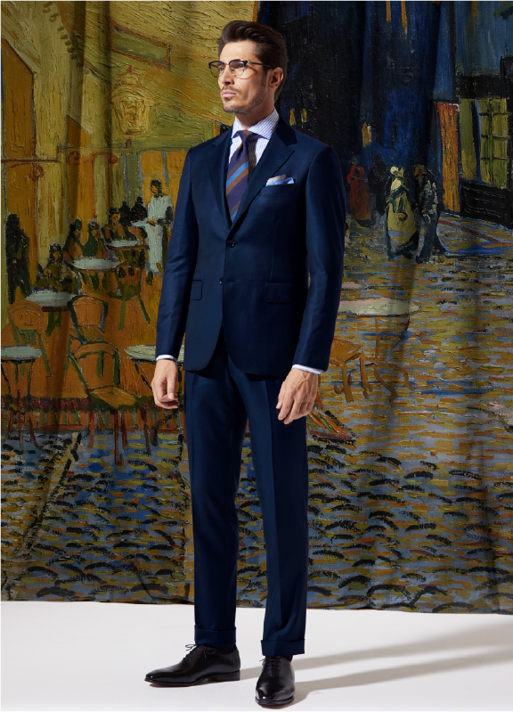 「オーストラリス」使用のネイビースーツは共地のベストも別売りで用意し、スリーピースとしても着用できます。極細繊維のウールならではの繊細な光沢と相まって、華やかなオケージョンにもうってつけのフォーマルスーツに。ベースは「ロンシャン」モデルゆえ若々しい雰囲気で着こなせます。