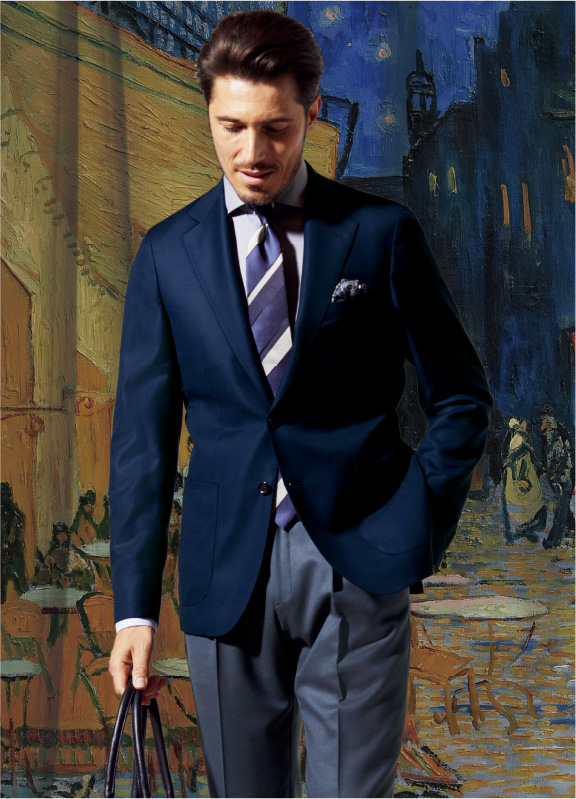 今季はロロ・ピアーナ社の「オーストラリス」を用いたシングルジャケットもラインナップ。羽織るような軽さとしなやかなドレープ感、そして繊細な光沢は、別格の高級感とエレガンスを演出。最も着用頻度が高いワードローブである、ネイビージャケットだからこそこだわる価値のある一着です。