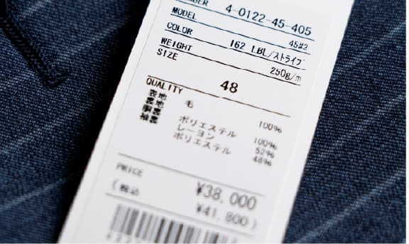 スーツの生地は色々ありますが、結局、着心地のよさを一番左右するのはウェイトですよね。そこでオンリーでは、値札に生地の重量を明記しています。生地の1mあたりの重さ(ℊ)を示すもので、このスーツの場合は1mあたりが250ℊであるということ。オンリーでは、その生地がどの季節に向いているかを判断する目安として使っています。