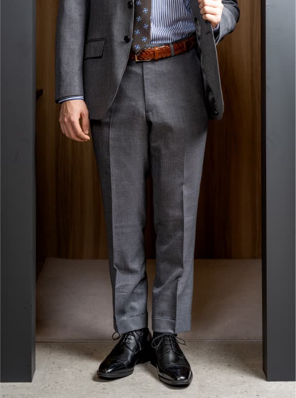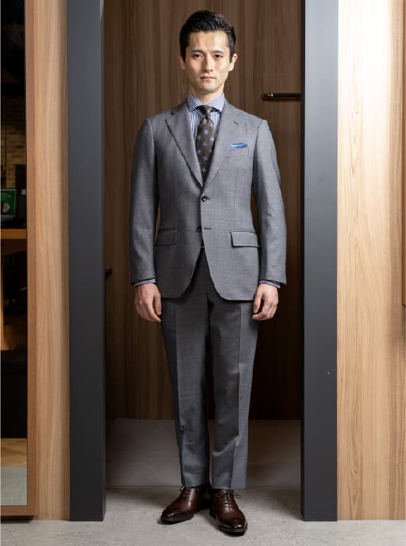 グレースーツはネイビーと並ぶ定番スーツ。都会的で洗練されたイメージを持つこの色のスーツは、欧米のエグゼクティブの間ではネイビースーツをしのぐ人気を誇ります。トーンの明るいライトグレーならクールな、黒に近いチャコールグレーならシックなイメージが強まります。