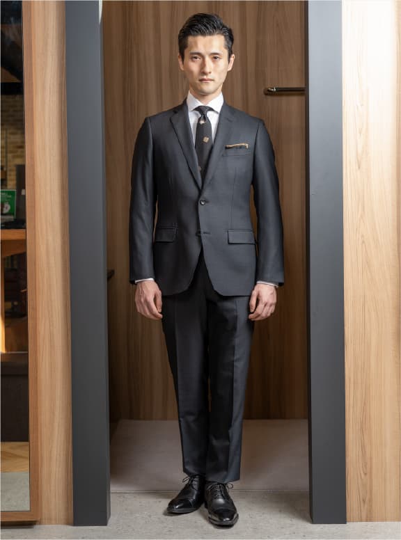 日本ではブラックスーツもビジネススーツとして認識されています。ネイビーやグレーとはひと味違うモードな気品のあるイメージが持ち味で、パーティにも映えるでしょう。ただ、ビジネススーツの場合は光沢のある生地が主流で、冠婚葬祭で着用する礼服の場合は光沢のない生地が用いられます。
