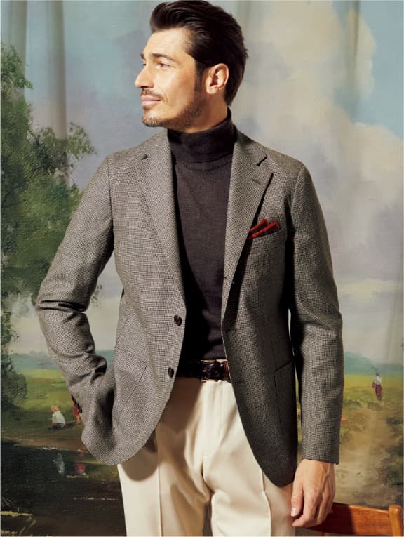 近目だとクラシックながら、遠目では無地に見えて着やすい、グレーとブラウンで構成した細やかな変形ハウンドトゥース生地使用のサンタルチア ゼロ モデル。こちらもカノニコ社のミルド トロピカルなので、軽量性は十分です。雰囲気がかっちりしすぎないので、タートルニットを合わせてもさまになります。
