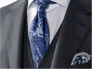 そこでVゾーンを全体的にアレンジしました。ネクタイはブルー系のペイズリータイで、シャツは白いツイルのカッタウェイカラーで華やかさを演出。さらにベストを加えてスリーピーススーツとして着ることで、大人っぽさもプラスしました。こうした装いなら、ビジネスからちょっとしたパーティまで対応できるでしょう。地味になりがちなチャコールグレースーツはVゾーンで艶足しを。これがこのスーツの攻略法です。