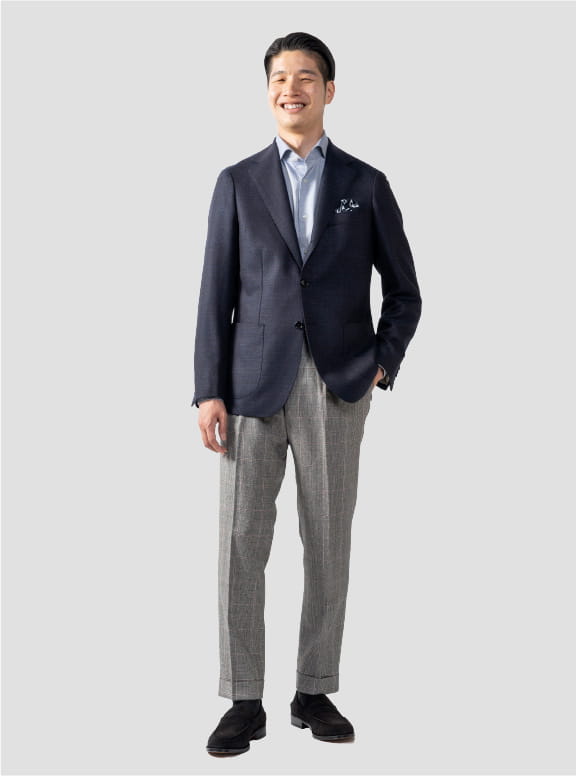 そうならないように、今回はスーツからジャケパンにガラッとスタイルチェンジしました。ジャケットはパッチポケットがスポーティなテイストを演出する紺ジャケ。首元の不在感を和らげるべく、ネクタイの代わりにポケットチーフを挿すのを忘れずに。パンツはグレーが鉄板ですが、無地だと少々カタい印象になるので、主張し過ぎないグレーベースのグレンチェック柄をチョイスしました。