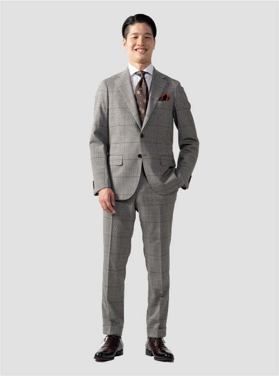 チェックスーツの個性を生かしつつ、スマートにまとめるためには、Vゾーンを工夫する必要があります。まず、ネクタイは今シーズン注目のブラウン系で。最近はネクタイの定番色の1つにもなっていますし、ネイビーやグレーのネクタイとはひと味違う大人の魅力や余裕を演出できますから。柄は主張が控えめな同系色の幾何学模様なんかがおすすめ。また、このスーツはチェック柄にブラウンが入っているので、いっそうスマートにまとまります。