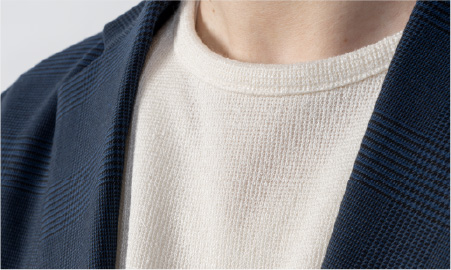 ブラウンというだけでも十分シブいのに、ツイードライクな起毛感とクラシックなグレンチェック柄が大人の色気を醸し出します。ちなみに見た目は落ち着いた雰囲気ですが、生地自体は軽くストレッチのきいたウールのジャージー素材ですので、着心地は楽チンです。