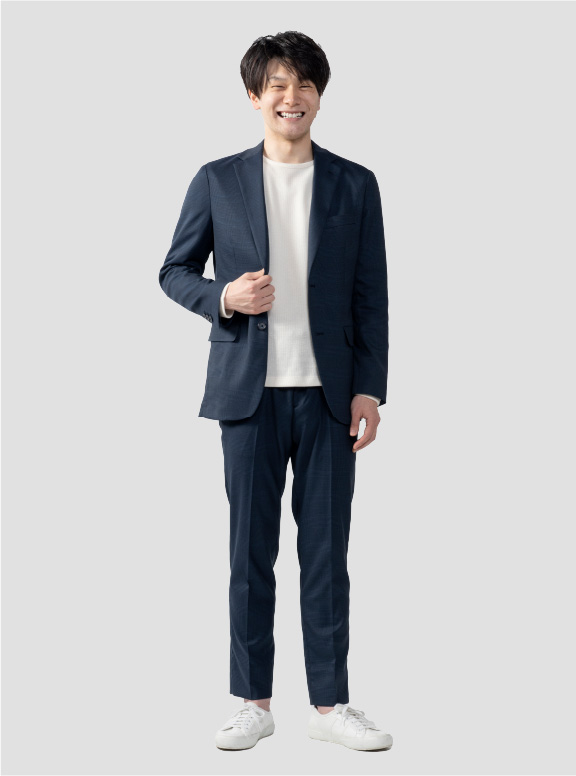 そこで私が提案するのが、“さり気にチェック”なセットアップスーツです。遠目だとネイビー無地のように見えるけど、近くで見ると同系色のグレンチェック柄。この生地がさり気なく個性を演出してくれるんです。