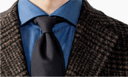 「チェックジャケットはVゾーンが難しそう……」と敬遠されるお客様も少なくないのですが、こんな風に無地のシャツとネクタイでまとめれば、すっきりスマートに着こなせます。今回は濃紺のデニムシャツとチャコールグレーのウールタイで落ち着いた雰囲気に。足元はジャケットの色身に合わせて、ブラウンスエードのスリッポンを選びました。