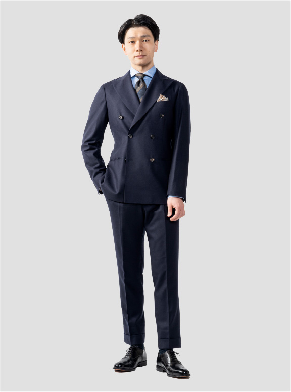 今回は特に着こなしやすいベーシックな紺無地の6つボタンをセレクト。Vゾーンはブルーのシャツとブラウン×ネイビーのレジメンタルタイで清潔感と落ち着きを演出しました。