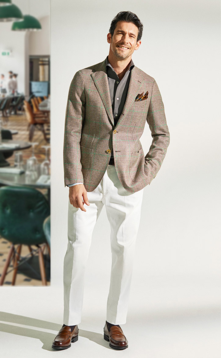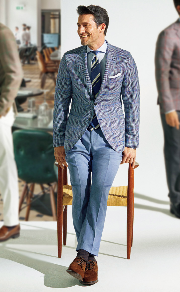 いかにも英国的な色使いである、ブラウン基調にヴィヴィッドなグリーンを効かせたバージョン。ノータイで羽織る場合は白シャツだと物足りなく感じることもありますが、グレーなどのカラーシャツなら簡単です。ボトムスをホワイトパンツにすれば、グリーンのオーバーペーンが春らしく映えます。