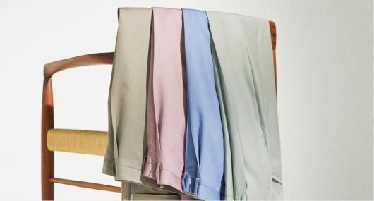 この春、提案するカラーパンツはややスモーキーで合わせやすい色調。