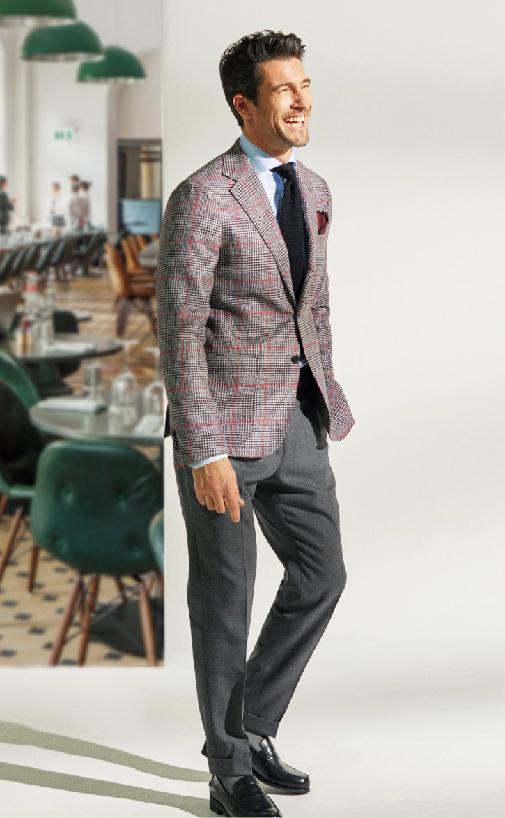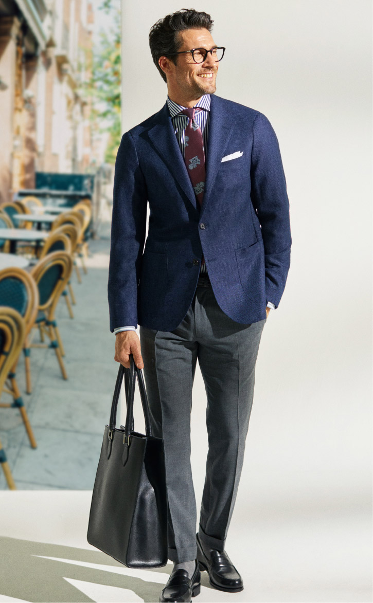 遠目ではネイビーの無地に見えつつ、近づくとブルーのバーズアイ調の柄が浮かび上がる「ジェーブリック」生地のジャケット。こんな遠近で印象が異なる素材も、今季のお勧めです。グレーパンツとの王道的なジャケパン合わせですが、ネイビーと相性のいいボルドー系でまとめたVゾーンが新鮮。
