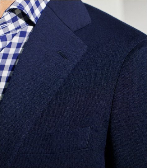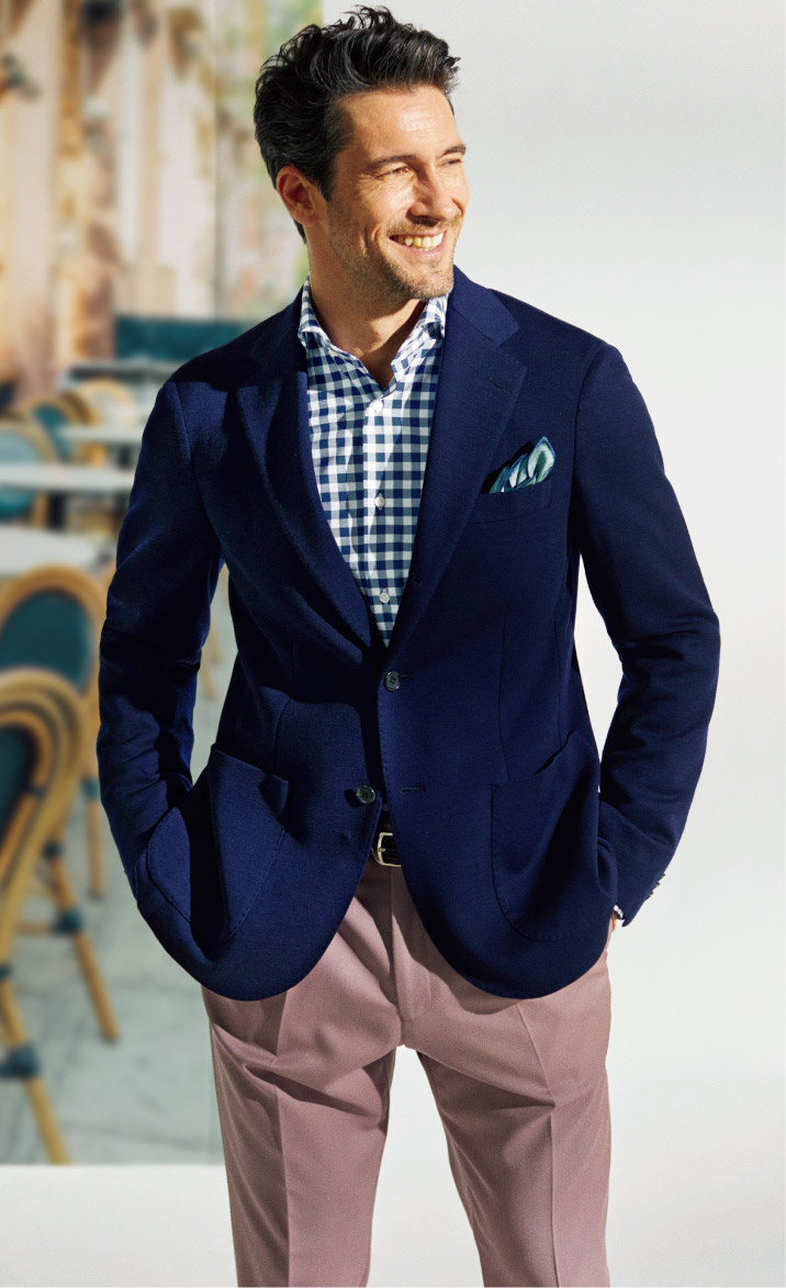 カノニコ社の誇る高級ウールジャージー「スーパーソニック」で仕立てたネイビージャケット。撥水性やシワ耐性、伸縮性に加え、ジャージーに見えない上品な表情です。柄目が大ぶりなギンガムチェックシャツとスモーキーピンクのカラーパンツを合わせれば、若々しくも上品な大人のプレッピースタイルに。