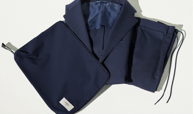 ひと揃えで多彩な着こなしが可能なセットアップは、普段はもちろん、荷物が限られる出張ではとくに重宝。そんな旅に最適なのが、付属バッグへたたんでコンパクトに収まるパッカブルモデルです。