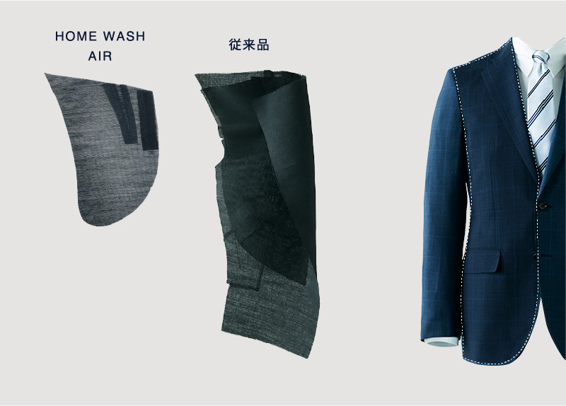 ホームウォッシュ エアのためだけに開発した軽量ウールポリエステル生地は、1mあたりわずか190g。また芯地には、オンリーオリジナルのハリある素材にウレタン樹脂加工を施すことで通気性と軽量性、さらに高級な天然毛芯に匹敵する芯地を採用。