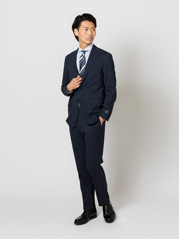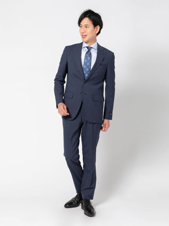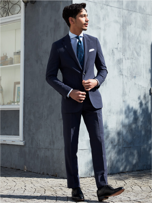 ネイビーの無地のスーツは、トレンドに左右されることのないオーセンティックな1着。その日の気分でVゾーンをコーディネイト。